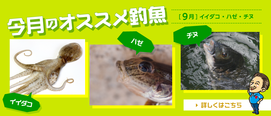 9月のオススメ釣魚は、イイダコ、ハゼ、チヌです。