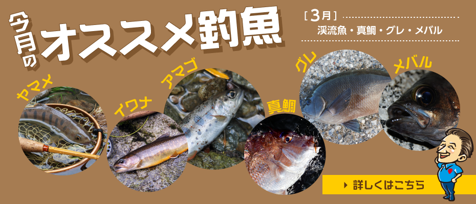 3月のオススメ釣魚は、渓流魚、真鯛、グレ、メバルです。