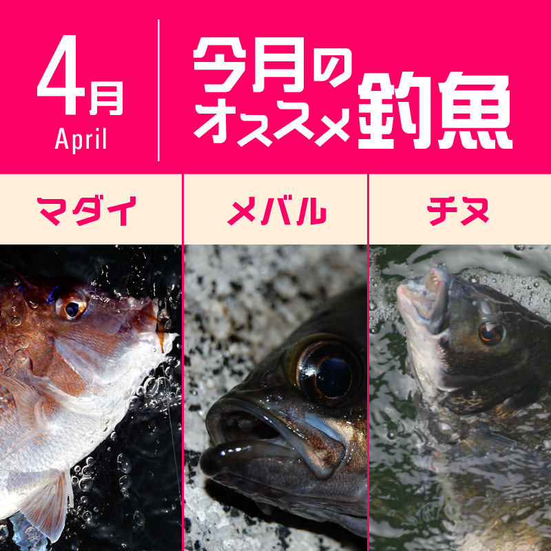 4月のオススメ釣魚は、チヌ、真鯛、メバルです。