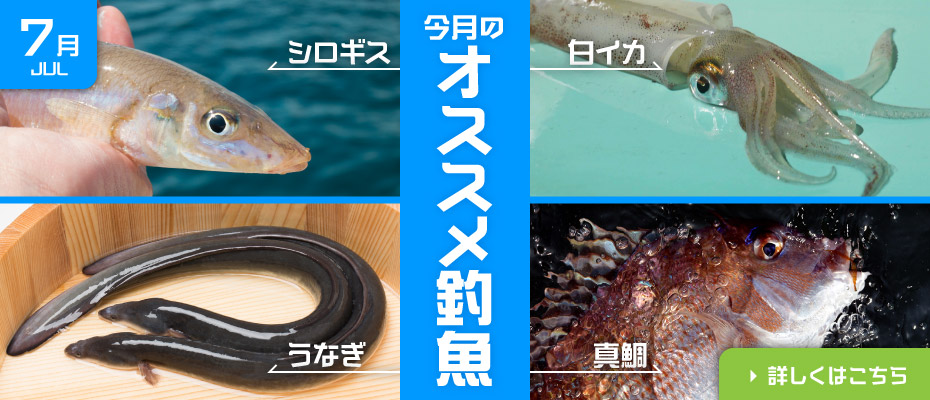 7月のオススメ釣魚はシロギス、白イカ、うなぎ、真鯛です。