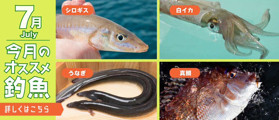 7月のオススメ釣魚はシロギス、白イカ、うなぎ、真鯛です。