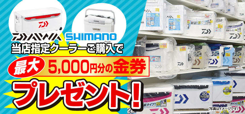 DAIWA、SHIMANOの当店指定のクーラーをご購入で、最大5,000円分の金券プレゼント!