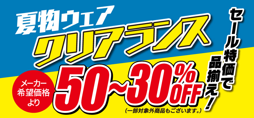 夏物ウェア クリアランス!セール特価で品揃え!半額品~30%OFF!